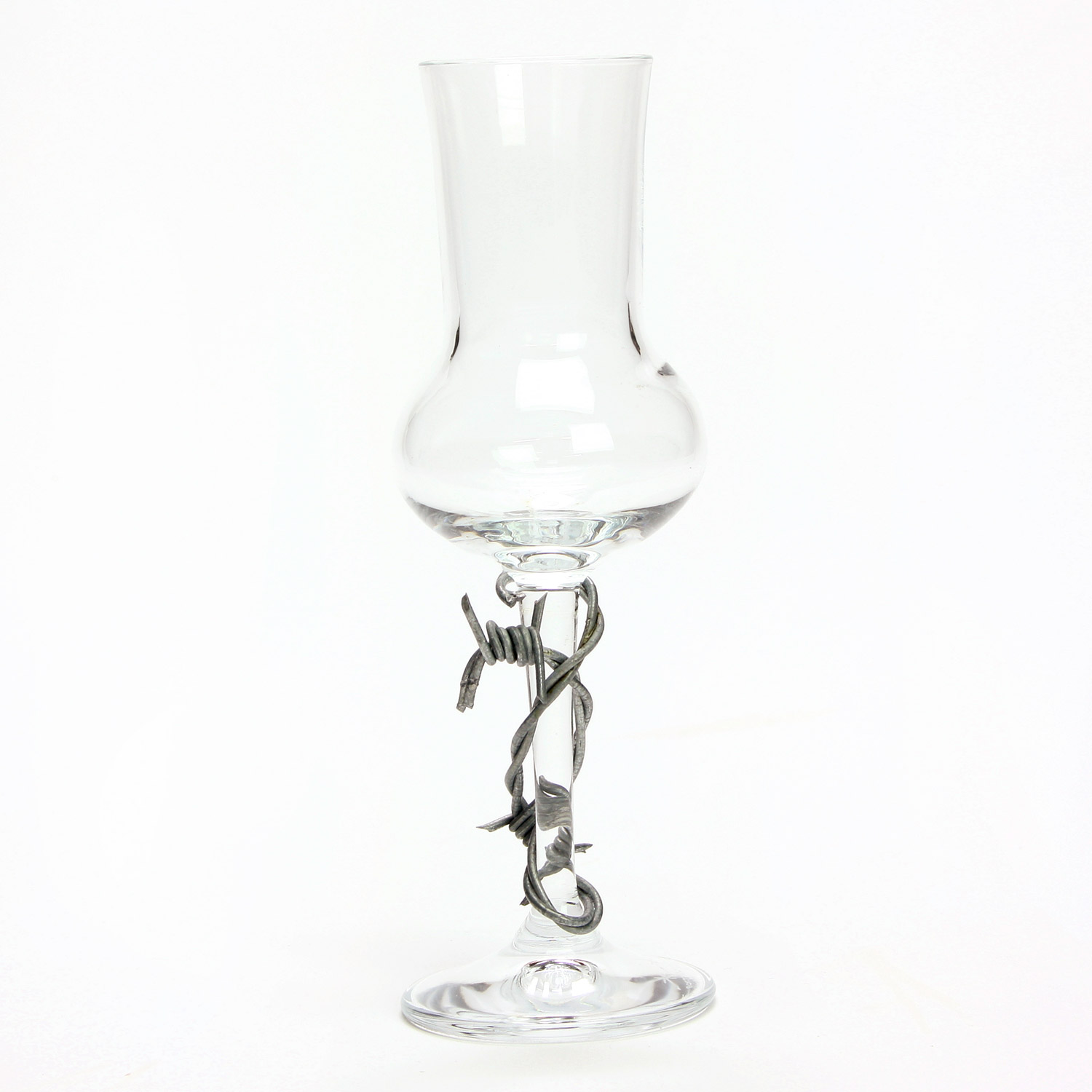 Flasche "Princessa" und Grappaglas mit Stacheldraht